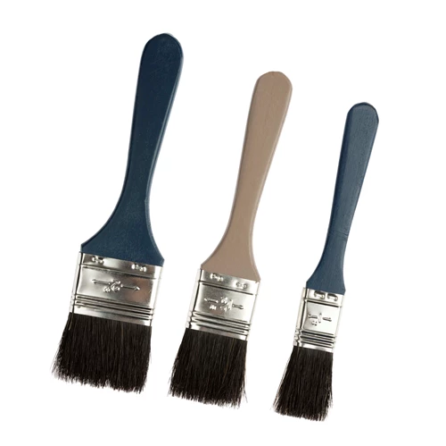 Tre penslar med träskaft och syntetborst, inklusive målartips "Måla fönster".