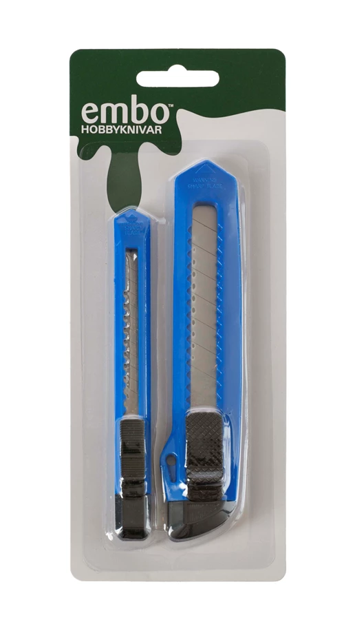 Säkerhetskniv. Bladet är inte låsbart i utfällt läge utan låses när det belastas. När belastningen upphör glider automatiskt bladet in.