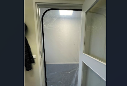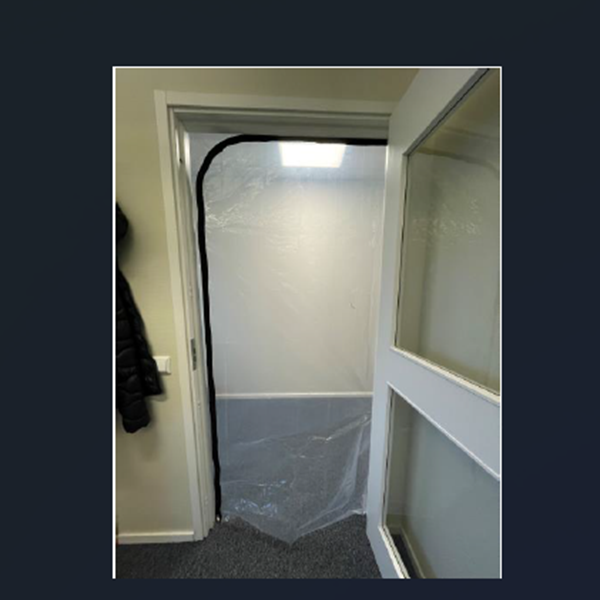 Dammskyddsdörr i kraftig PVC-plast. Enkel att sätta upp med klammer eller tejp. Efter användning torka av vik ihop och använd nästa gång.